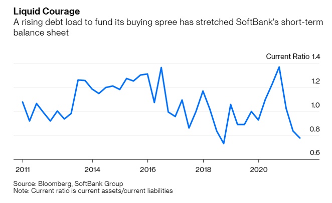 衡量其财务状况的其中一个关键指标已降至近三年来的最低水平,这是一个无法被股价反弹掩盖的指标。软银的流动比率降至0.78,这个数字低于1意味着到期需偿还的资金比目前可用的流动资产数量还要多。计算这一数字的分子端主要包括现金和应收账款,这两项资产均有所下降,而分母端的债务主要是在未来12个月内支付的贷款和债券,而它们均有所上升。