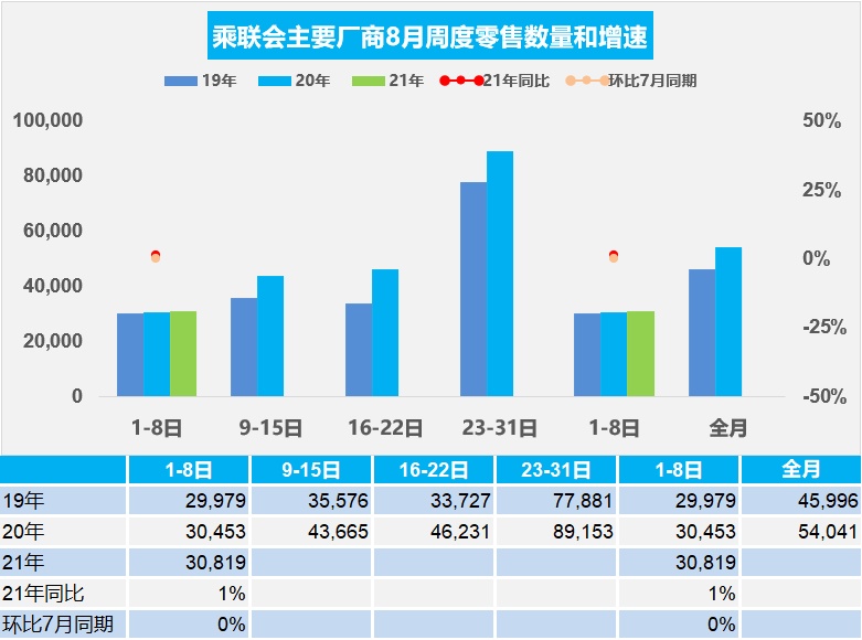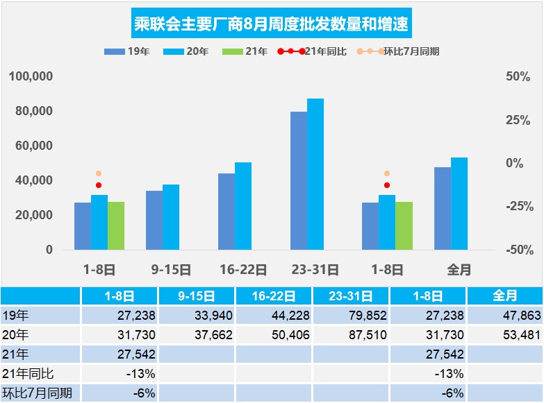 部分车企的高温假集中在8月上旬,生产部门在芯片不足的情况下集中休假。8月初的厂商产销相对平淡, 8月初的高温假休因素导致批发偏低,因此对比7月同期,批发表现相对稍低。
