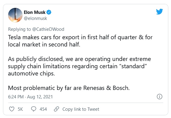 马斯克表示:“正如公开披露的那样,我们在某些“标准”汽车芯片方面面临供应链的限制”“到目前为止,最大的问题来自瑞萨和博世。”