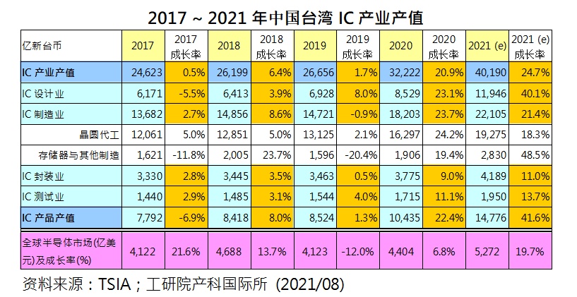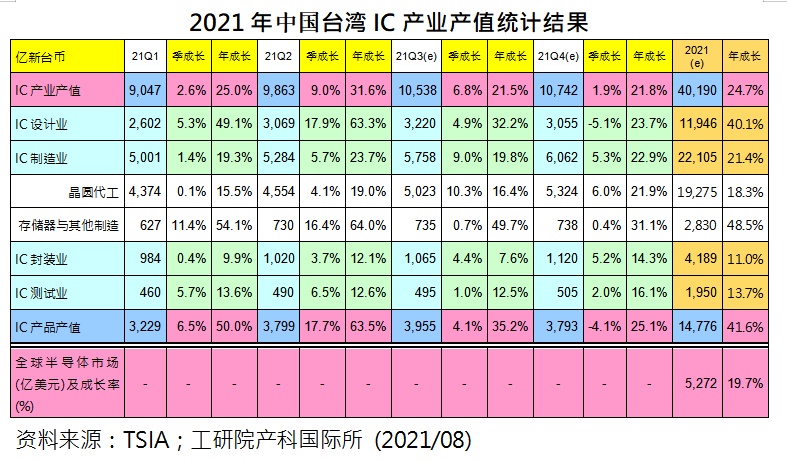 智通财经APP获悉,8月13日,中国台湾半导体产业协会称,2021年第二季中国台湾整体IC产业产值达333亿美元,较上季成长9.0%,较2020年同期成长31.6%。其中,IC设计业产值为109亿美元,环比增长17.9%,同比增长63.3%;IC制造业为179亿美元,环比增长5.7%,同比增长23.7%,其中,晶圆代工为154亿美元,环比增长4.1%,同比增长19.0%,存储器与其他制造为25亿美元,环比增长16.4%,同比增长64.0%;IC封装业为34亿美元,环比增长3.7%,同比增长12.1%;IC测试业为17亿美元,环比增长6.5%,同比增长12.6%。
