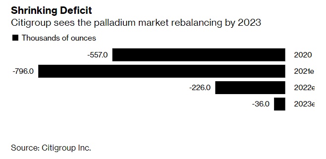 Cooper称,疫情后汽车生产的复苏和更严格的排放标准将在短期内支撑消费。她表示,在计划开发的背景下,钯金产量将回升,再加上需求放缓,这将使钯金在未来五年内接近平衡,甚至转为过剩。花旗虽然短期内看涨,但预计2023年市场将接近供需平衡。