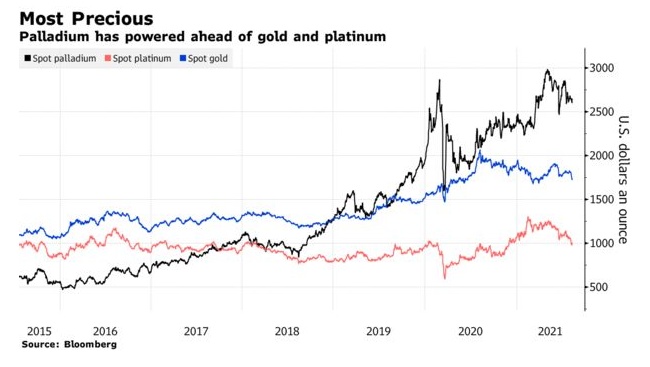 钯金在过去几年中击败了铂和黄金等其他主要贵金属,这得益于中国和欧洲更严格的排放标准,以及在2015年大众汽车发生排放欺诈丑闻后,大众减少了柴油动力汽车的使用(其催化转化器使用铂金)。另外,该金属的产量(主要来自俄罗斯和南非)一直难以跟上,导致了严重的供应短缺。