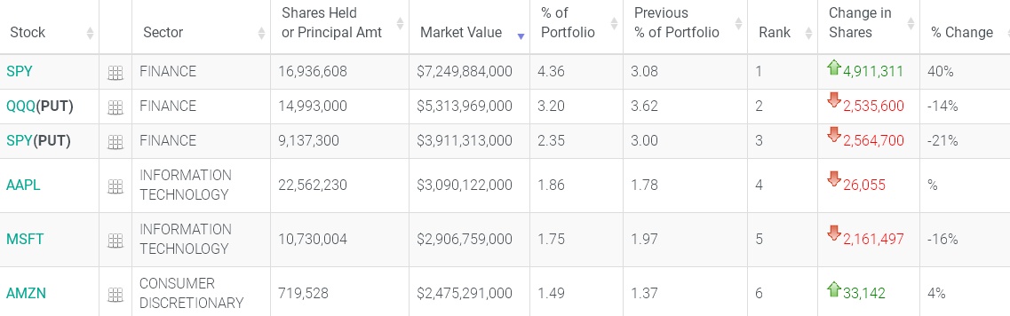 在前五大重仓股中,标普500指数ETF(SPY.US)位列第一,持仓1693.7万股,持仓市值72.50亿美元,较上季度持仓数量增长了40%,占投资组合比例为4.36%。纳指100ETF看跌期权(QQQ.US,PUT)位列第二,持仓1499.3万股,持仓市值约53.14亿美元,较上一季度下降14%,占投资组合比例为3.20%。第三位为标普500指数看跌期权(SPY.US,PUT),持仓市值为39.11亿美元。第四位为苹果(AAPL.US),持仓市值为30.90亿美元。第五和第六位分别为微软(MSFT.US)和亚马逊(AMZN.US),持仓市值分别为29.07亿美元和24.75亿美元。