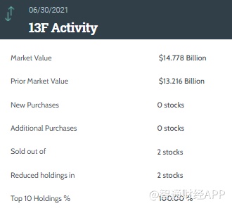 据统计,凯雷第二季度持仓总市值达147.78亿美元,上一季度总市值为132.16亿美元,环比增长11.82%。凯雷在二季度的持仓组合中新增了0只个股,增持了0只个股,减持了2只个股并清仓了2只个股。其中前十大持仓标的占总市值的100%。
