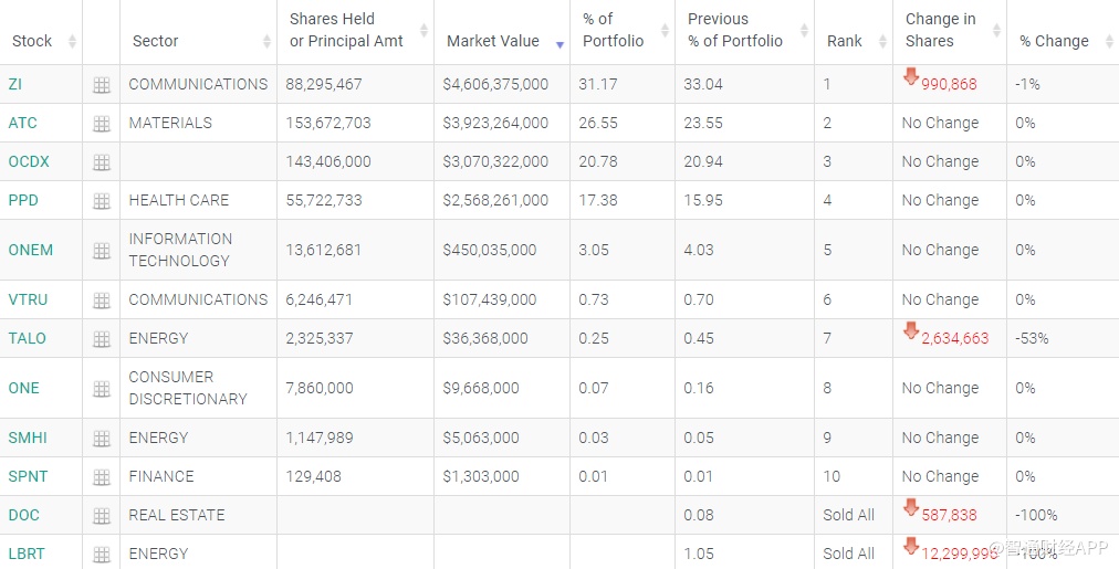 在前五大重仓股中,互联网营销公司ZoomInfo(ZI.US)位列第一,仓位比重为31.17%,持仓市值约46.06亿美元。