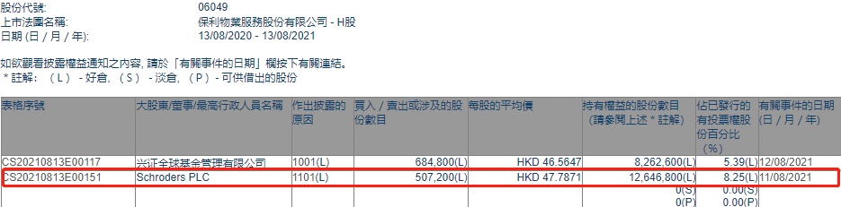 PLC增持保利物业(06049)50.72万股,每股作价47.7871港元,总金额约为2423.76万港元。增持后最新持股数目约为1264.68万股,最新持股比例为8.25%。