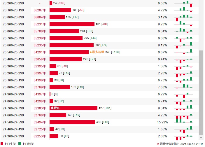 牛证街货重货区在24,700-24,799区间,该区间最新牛证数量为427张,较上一交易日增加31张;最多新增在25,500-25,599区间,该区间最新牛证数量为348张,较上一交易日增加119张。