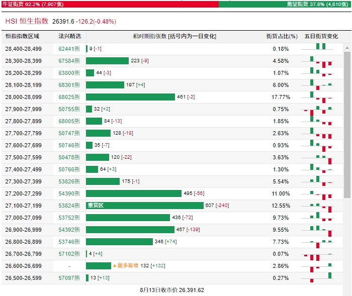 法兴恒指牛熊证街货分布图中的数据显示,熊证街货重货区在27,100-27,199区间,该区间最新熊证数量为607张,较上一交易日减少240张;最多新增在26,600-26,699区间,该区间最新熊证数量为132张,较上一交易日增加132张。