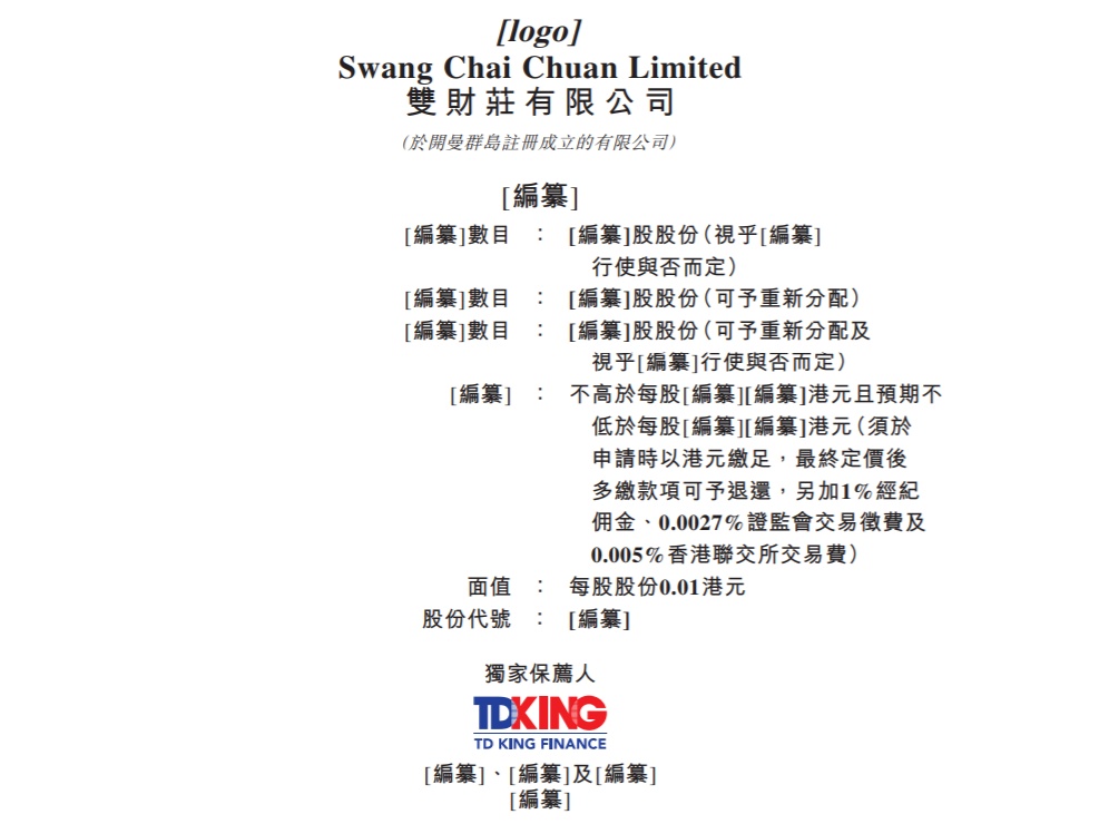 智通财经APP获悉,据港交所8月13日披露,双财庄有限公司(Swang Chai Chuan Limited)再次申请在港交所主板上市,TD KING FINANCE为其独家保荐人。