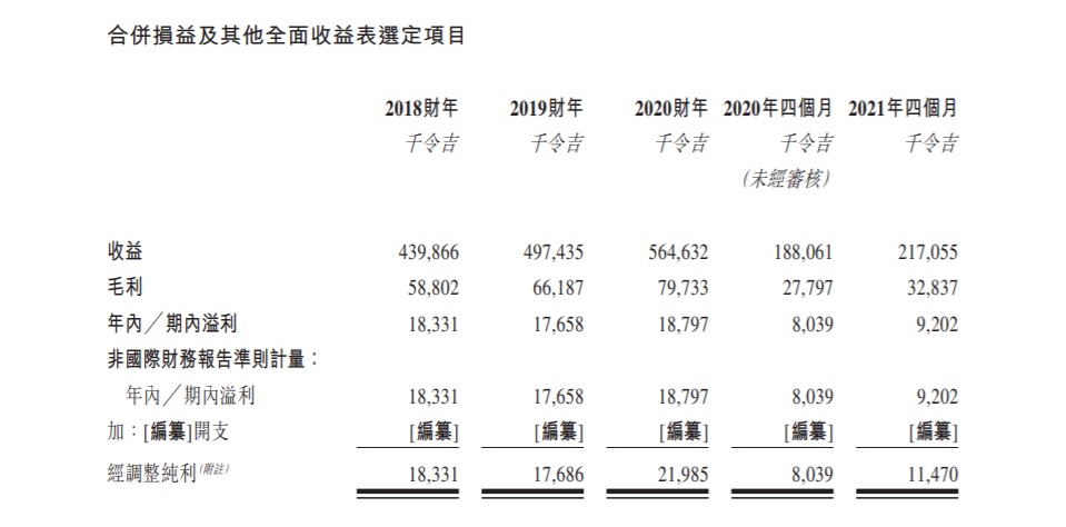 该公司于2018财年、2019财年、2020财年及2021年四个月的收益分别约为4.40亿令吉、4.97亿令吉、5.65亿令吉及2.17亿令吉,该公司的净利润分别约为 1833.1万令吉、1765.8万令吉、1879.7万令吉及920.2万令吉。