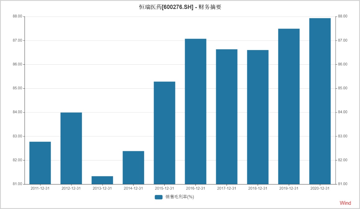 由于高毛利的创新药占比提升,公司的销售毛利率也逐年提高,从2011年82.77%上升到2020年的87.93%,如此高的毛利率水平,“药中茅台”的称号当之无愧。
