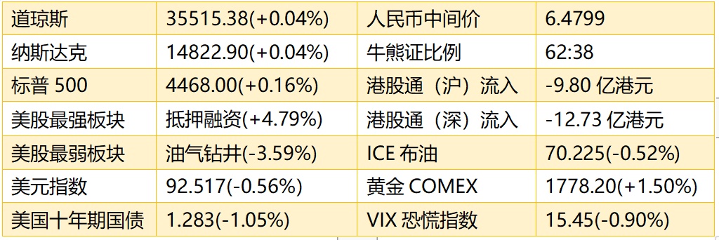 1、隔夜美股截至收盘,道指涨15.53点或0.04%,报35515.38点;纳指涨6.64点或0.04%,报14822.90点;标普500指数涨7.17点或0.16%,报4468.00点。港股ADR指数上涨,按比例计算,收报26406点,上涨14.78点或0.06%。