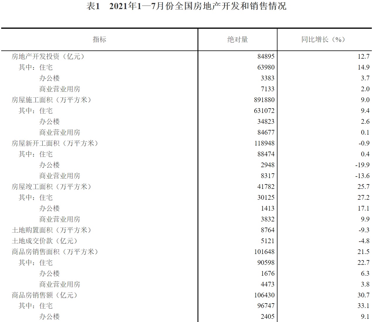 1—7月份,商品房销售面积101648万平方米,同比增长21.5%;比2019年1—7月份增长14.5%,两年平均增长7.0%。其中,住宅销售面积增长22.7%,办公楼销售面积增长6.3%,商业营业用房销售面积增长3.8%。商品房销售额106430亿元,增长30.7%;比2019年1—7月份增长28.0%,两年平均增长13.1%。其中,住宅销售额增长33.1%,办公楼销售额增长9.1%,商业营业用房销售额增长5.0%。