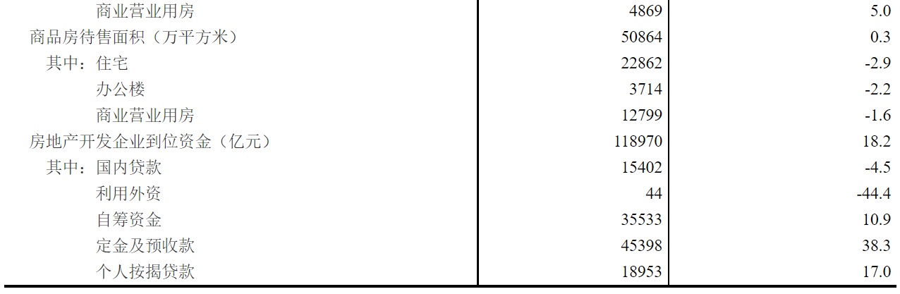 7月末,商品房待售面积50864万平方米,比6月末减少215万平方米。其中,住宅待售面积减少270万平方米,办公楼待售面积减少26万平方米,商业营业用房待售面积增加19万平方米。