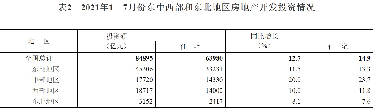 1—7月份,东部地区房地产开发投资45306亿元,同比增长11.5%;中部地区投资17720亿元,增长20.0%;西部地区投资18717亿元,增长10.0%;东北地区投资3152亿元,增长8.1%。