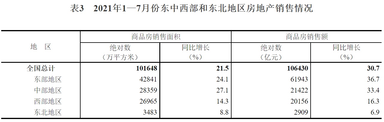 1—7月份,东部地区商品房销售面积42841万平方米,同比增长24.1%;销售额61943亿元,增长36.7%。中部地区商品房销售面积28359万平方米,增长27.1%;销售额21422亿元,增长33.4%。西部地区商品房销售面积26965万平方米,增长14.3%;销售额20156亿元,增长16.3%。东北地区商品房销售面积3483万平方米,增长8.8%;销售额2909亿元,增长6.9%。