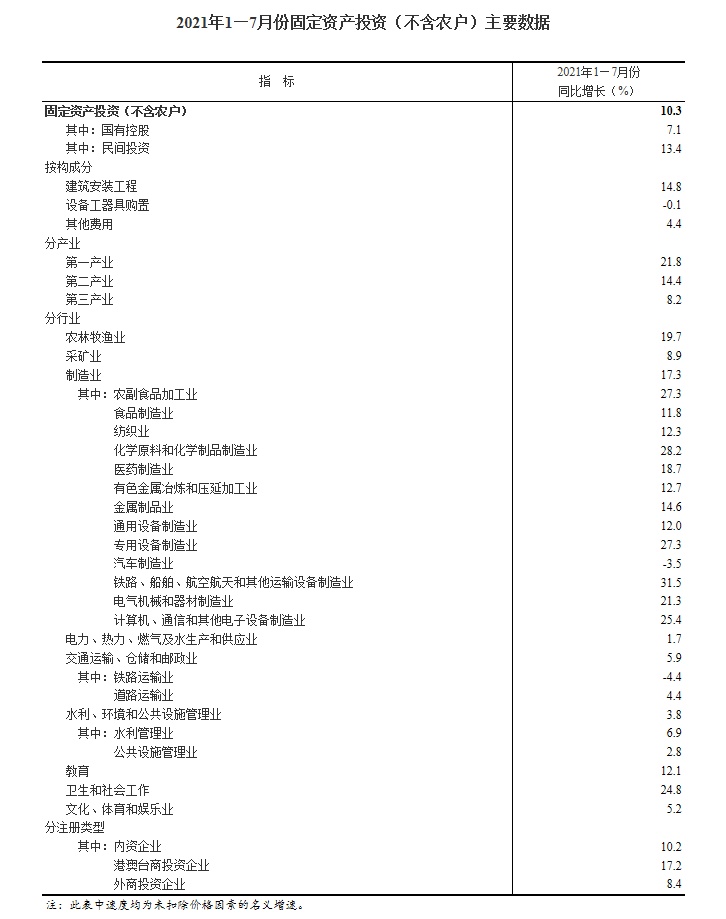 智通财经APP获悉,8月16日,国家统计局发布2021年1—7月份全国固定资产投资(不含农户)统计数据。1—7月份,全国固定资产投资(不含农户)302533亿元,同比增长10.3%;比2019年1—7月份增长8.7%,两年平均增长4.3%。其中,民间固定资产投资173473亿元,同比增长13.4%。从环比看,7月份固定资产投资(不含农户)增长0.18%。