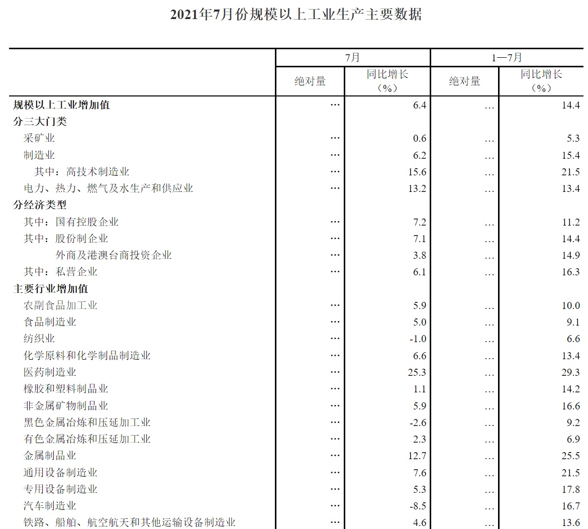 7月份,规模以上工业增加值同比实际增长6.4%(以下增加值增速均为扣除价格因素的实际增长率),比2019年同期增长11.5%,两年平均增长5.6%。从环比看,7月份,规模以上工业增加值比上月增长0.30%。1—7月份,规模以上工业增加值同比增长14.4%,两年平均增长6.7%。