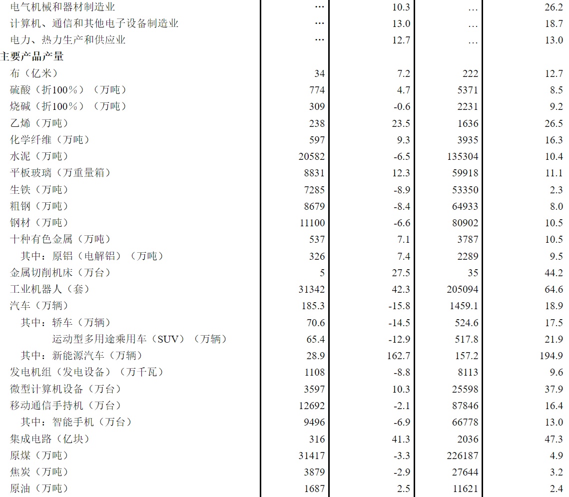 分产品看,7月份,612种产品中有333种产品产量同比增长。钢材11100万吨,同比下降6.6%;水泥20582万吨,下降6.5%;十种有色金属537万吨,增长7.1%;乙烯238万吨,增长23.5%;汽车185.3万辆,下降15.8%,其中,新能源汽车28.9万辆,增长162.7%;发电量7586亿千瓦时,增长9.6%;原油加工量5906万吨,下降0.9%。