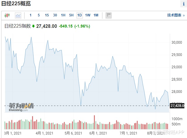 周一开盘,日经225指数开跌,并在盘初将迅速跌至1.28%。目前,该指数跌幅扩大至1.96%。