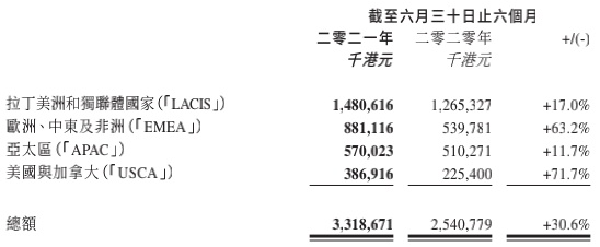 从财报来看,报告期内百富环球在所有业务地区均取得了显著的增长。具体来看,百富环球在LACIS(拉丁美洲和独联体国家)、EMEA(欧洲、中东及非洲)、APAC(亚太区)及USCA(美国与加拿大)四大业务区域分别实现营收14.81亿港元、8.81亿港元、5.7亿港元、3.87亿港元,同比分别增长了17%、63.2%、11.7%、71.7%。