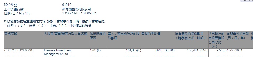 智通财经APP获悉,香港联交所最新资料显示,8月11日,Hermes Investment Management减持新秀丽(01910)13.4609万股,每股作价13.87港元,总金额约为186.7万港元。减持后最新持股数目约为1.36亿股,最新持股比例为9.51%。