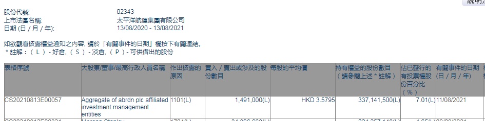 智通财经APP获悉,香港联交所最新资料显示,8月11日,Aggregate of abrdn plc affiliated investment management entities增持太平洋航运(02343)149.10万股,每股作价3.5795港元,总金额约为533.70万港元。增持后最新持股数目约为3.37亿股,最新持股比例为7.01%。