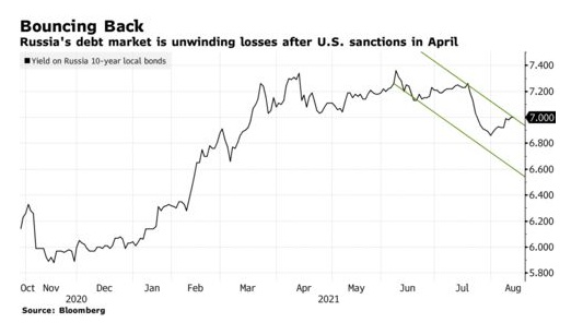 数月以来,人们对美国总统拜登领导下严厉的美国制裁政策感到担忧,但在此后,投资者的情绪开始转向俄罗斯市场。4月份,当制裁被视为是温和的时候,俄罗斯国债收益率出现了下滑,随后,在俄罗斯央行上月加息整整一个百分点后,收益率暴跌,这是自2014年卢布危机以来的最大幅度加息。目前,俄罗斯10年期国债的收益率约为7%,而年初约为6%。