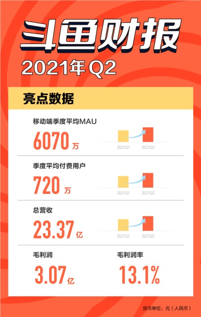 北京时间8月16日,“以电竞为核心的多元化社区”斗鱼(DOYU.US)发布了2021年第二季度财务报告。财报显示,该季度斗鱼移动端MAU(季度平均活跃用户数)达6070万,再创历史新高;总营收达23.37亿元,较第一季度环比增长8.6%;毛利润从第一季度的2.6亿增长至3.07亿,环比增长17.8%,毛利率为13.1%。