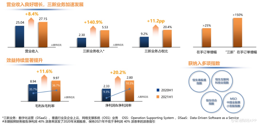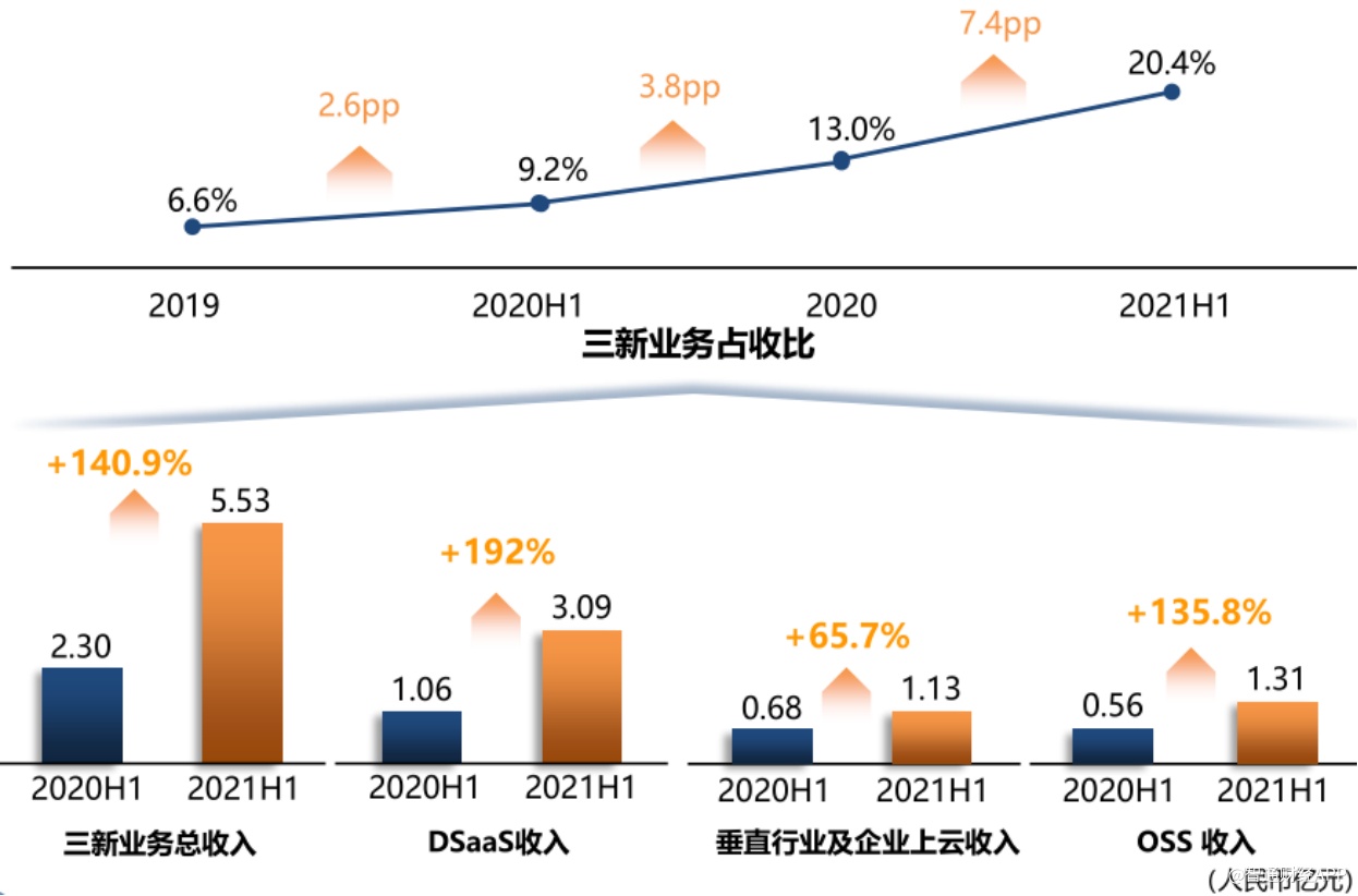 数字化时代下,随着政府、大型企业将数字化提至新的高度,则为数字运营生态发展提供了良好机遇。据智通财经APP了解到,2021年上半年,亚信科技DSaaS业务实现收入约人民币3.09亿元,同比上升192.0%;DSaaS业务占总收入比重已达11.4%,增速及占收比均再创新高,成为“三新”业务中最为强劲的驱动力。