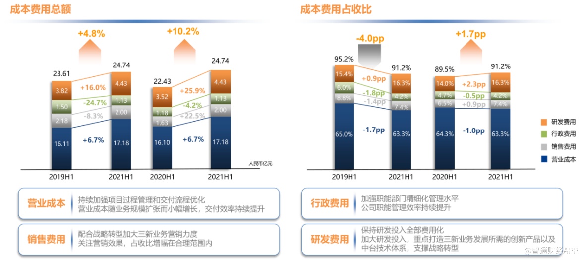 另智通财经APP了解到,上半年,公司总体成本费用占收比较去年同期提升了1.7个百分点,主要集中在研发和销售两个方面。其中,公司研发费用占收比同比提升2.3分百分点,为公司上半年成本投入增幅最大的领域。除此之外,公司销售费用占收比的增加,则主要与三新业务拓展有关。