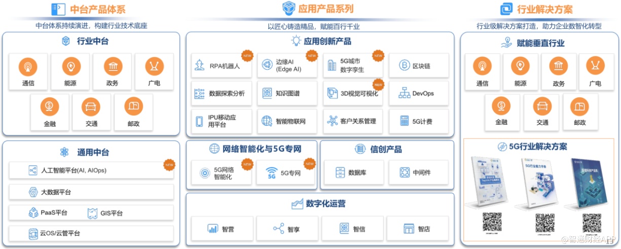 其中,中台产品体系既包括通用中台(如人工智能、大数据、PaaS、云OS、云管平台等),也包括带有行业特征的行业中台(如通信行业、能源行业、政务、广电等)。此外,应用产品体系中,RPA机器人、边缘AI、5G城市数字孪生、3D视觉可视化等,均是投入的重要领域,并已取得良好成果,以支撑三新业务发展。
