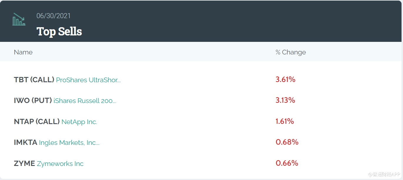 前五大卖出标的分别为20年期美国债指数两倍做空ETF(TBT.US)、罗素2000成长股指数ETF(IWO.US)、美国网存(NTAP.US)看涨期权、连锁超市安格莱斯市场(IMKTA.US)以及临床阶段生物制药公司Zymeworks(ZYME.US)。