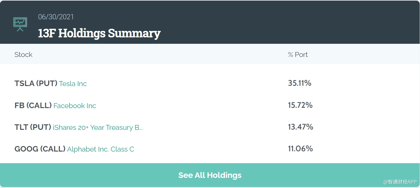目前该基金的前五大仓位分别为特斯拉(TSLA.US)看跌期权、Facebook(FB.US)看涨期权、iShares 20年期以上美国国债ETF(TLT.US)看跌期权、谷歌(GOOG.US)看涨期权以及麦克森药物批发(MCK.US)看涨期权。