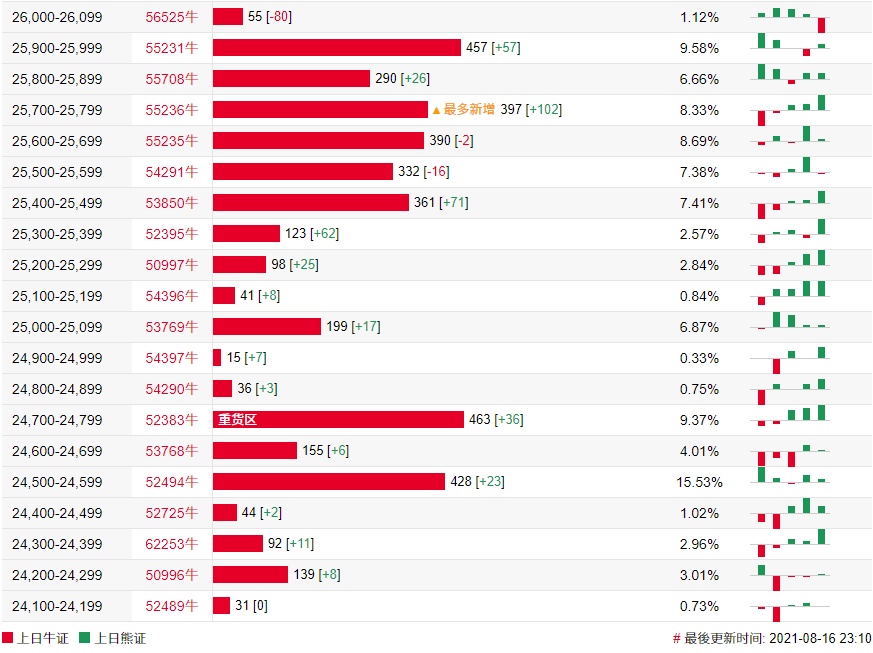 牛证街货重货区在24,700-24,799区间,该区间最新牛证数量为463张,较上一交易日增加36张;最多新增在25,700-25,799区间,该区间最新牛证数量为397张,较上一交易日增加102张。