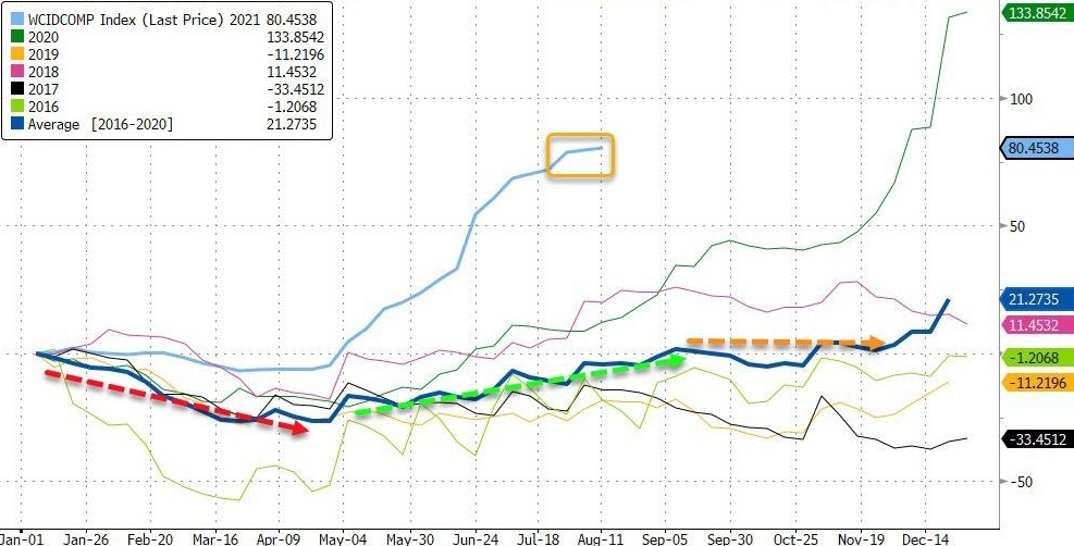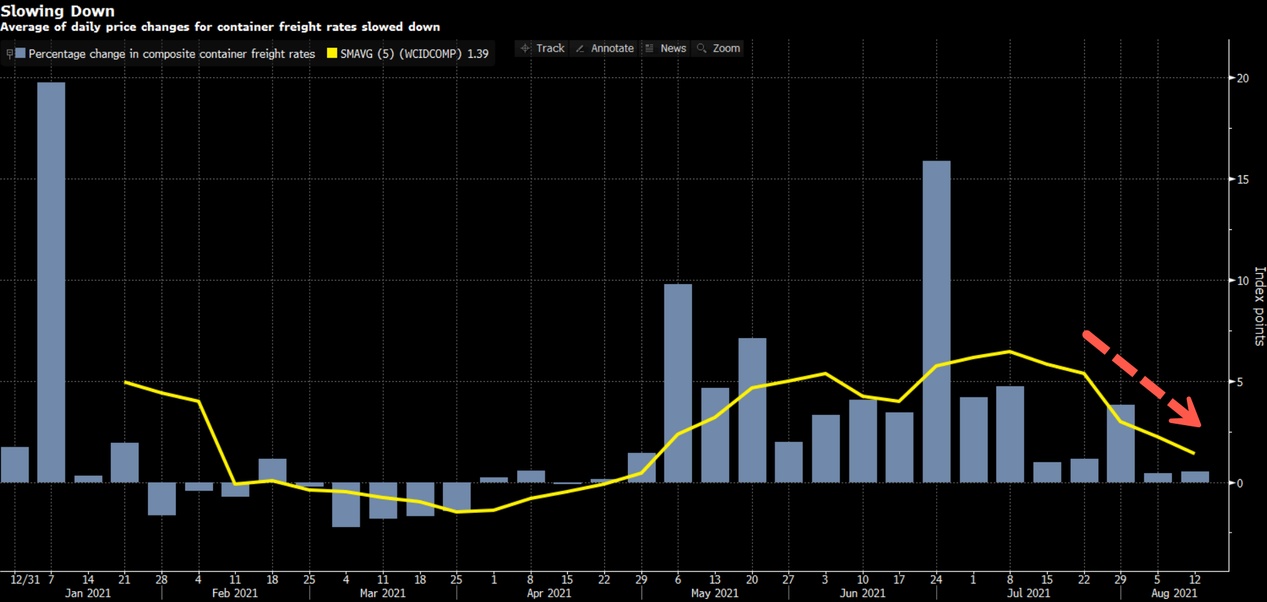 WCI综合集装箱运价基准比率五周平均涨幅显示,自7月中旬以来,价格上涨势头一直在减弱。 目前的比率约为1.4%,与7月初的5%相比有很大的变化。