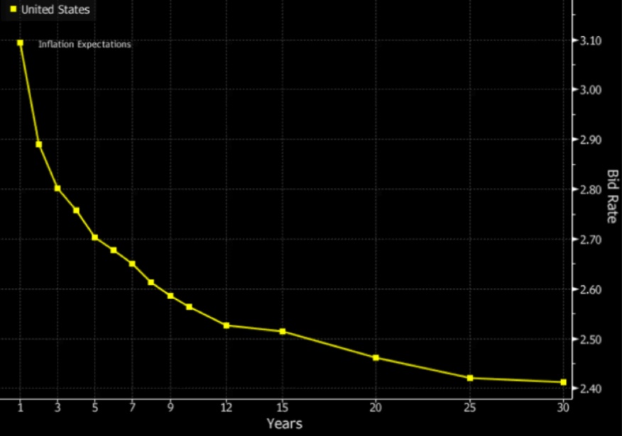 通胀掉期和美国盈亏平衡曲线显示,利率交易员预计未来通胀水平将会下降。下图显示,通胀互换在一年内达到3%,但随后几年又回落至2%。