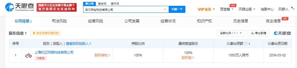 股东信息显示,该公司由哈啰出行关联公司上海钧正网络科技有限公司全资控股。