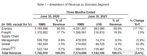 按业务划分,快递业务营收为42.81亿元,同比下降17.1%;货运业务营收13.99亿元,同比增长2%;供应链管理业务营收4.80亿元,同比下降5.9%;全球业务营收3.15亿元,同比增长63.4%;其他业务营收9.01亿元,同比增长72.5%。