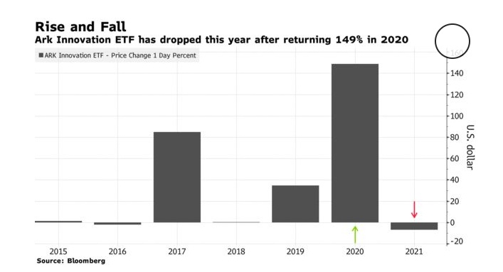 Ark Innovation ETF在2020年回报率为149%后,今年出现了下跌