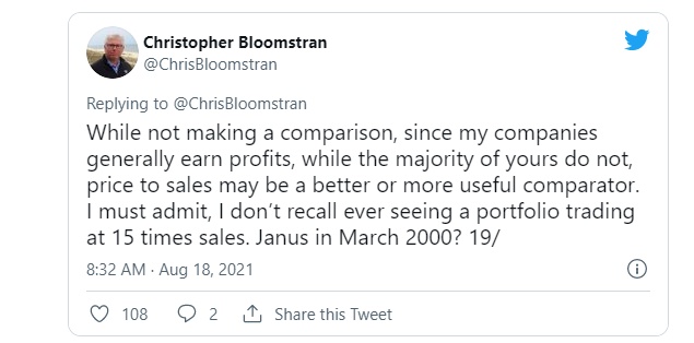 Semper Augustus Investments Group LLC的首席投资长克里斯·布卢姆斯特兰(Chris Bloomstran)在Twitter上发表了他对伍德的Ark Innovation ETF及其空头头寸的看法。在他的一些帖子中,他向Wood解释了估值和回报率的细微差别。Bloomstran在推特上写道,这只ETF的前10支股票中有6支正在赚钱,而“坏消息是,市盈率比我习惯看到的要高一些。”“我的结论是,伍德的团队必须依靠很高增长来获益。