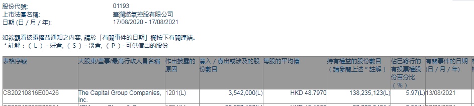 智通财经APP获悉,香港联交所最新资料显示,8月13日,美国资本集团减持华润燃气(01193)354.2万股,每股作价48.797港元,总金额约为1.73亿港元。减持后最新持股数目约为1.38亿股,最新持股比例为5.97%。