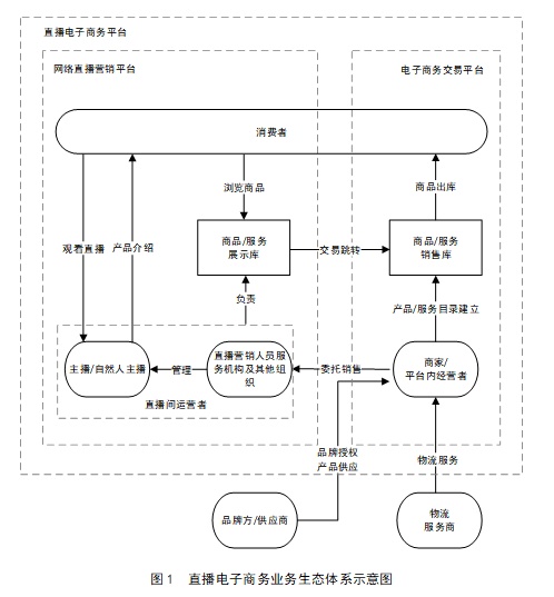 直播电子商务业务生态体系主要涉及直播营销平台、电子商务交易平台、直播营销人员服务机构、主播、消费者(用户)、商家(平台内经营者)和相关服务提供商(如物流服务商、品牌方)等。直播电子商务业务生态体系如图1所示,其中: