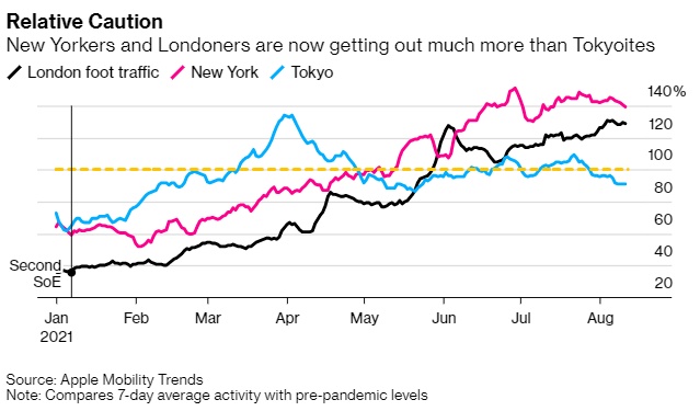 在上个季度,日本成功避免了经济衰退,很大程度上是因为消费者对日本政府关于病毒的警告置之不理。根据日本内阁府于8月16日公布的数据,日本第二季度GDP环比微升0.3%,按年率计算增长1.3%。日本GDP在第一季度按年率计算下滑5.1%后呈现反弹。但根据Apple Mobility Trends统计的数据,东京的总体活动水平仍远低于纽约和伦敦。