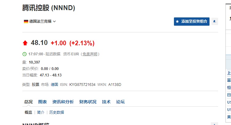 智通财经APP获悉,今日(8月18日)港股盘后,腾讯(00700)公布超预期的第二季度业绩数据。受财报利好刺激,截至北京时间17:07,德国法兰克福市场上,腾讯控股上涨2.13%,报48.10欧元,折合439.19港元,较港股收盘价436.2港元涨约0.7%。
