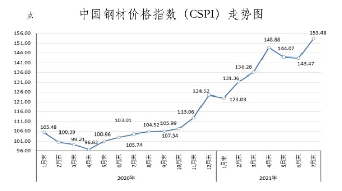 据钢铁协会检测,7月末,中国钢材价格指数(CSPI)升至153.48点,环比增长10.01点,升幅为6.98%;较去年同期升48.96点,升幅为46.84%。