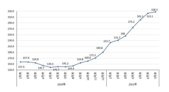 7月份,国际钢材价格指数(CRU)为328.3点,环比上升5.2点,升幅为1.6%,较上月收窄5.7个百分点;较上年同期上升187.1点,升幅为132.5%。下图为国际钢材价格指数走势图。