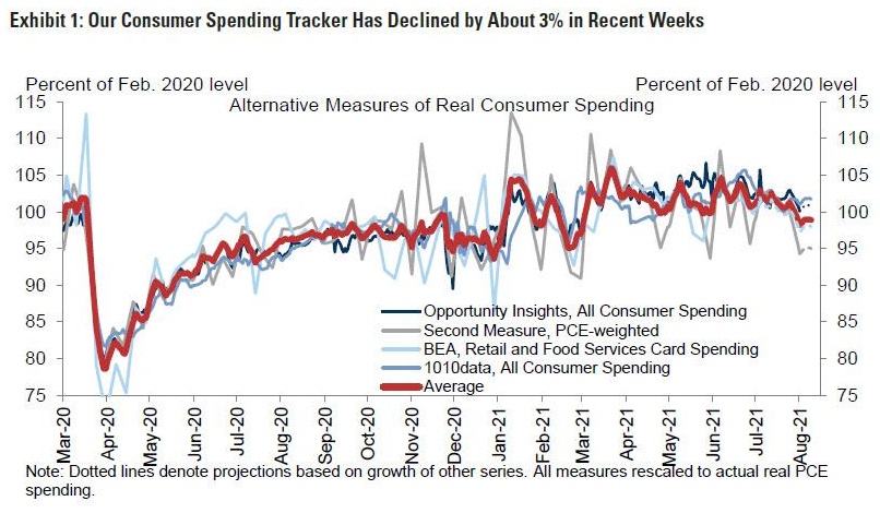 在消费方面,高盛上月略微下调了2021H2的预测,预计新的病毒传播将推迟办公室附近经济和对病毒最敏感的服务(如娱乐活动)的全面复苏。 但如下图所示,7月份零售额的下降和8月初消费者支出的下降表明,支出的放缓幅度大于高盛的预期。
