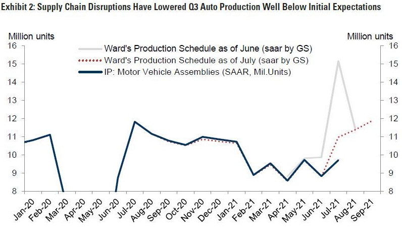 高盛的汽车分析师指出,汽车制造商现在预计,半导体供应短缺对全球汽车第三季度生产的影响将和第二季度几乎一样大,而且在第三季度或第四季度末之前,供应不会增加。 如下图所示,美国第三季度汽车生产计划过于乐观。 因此,高盛已经将第三季度的库存积累预期从820亿美元下调至320亿美元,尽管从第二季度库存急剧下降的情况来看,美国第三季度的GDP增长仍有4个百分点的价值。