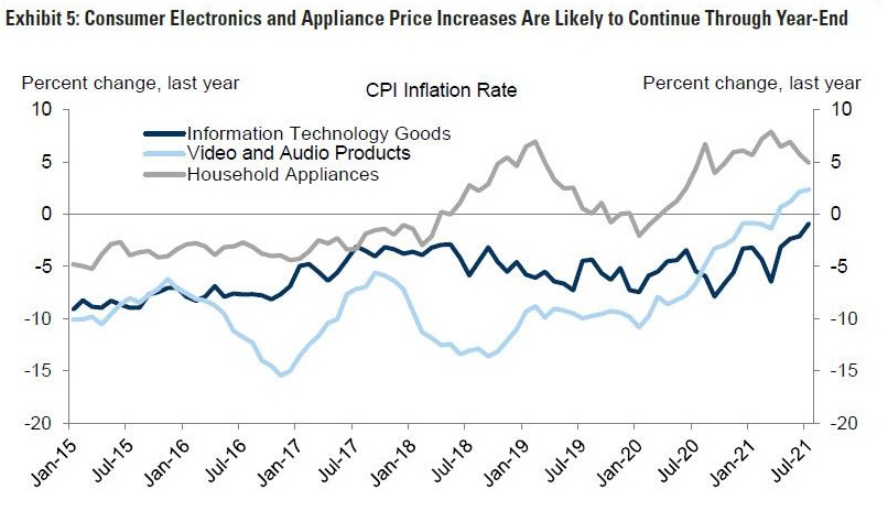 其他受半导体短缺影响的耐用品,如消费电子产品和家用电器,如下图所示,今年的通胀率也远高于正常水平,反映出供应紧张和需求强劲。高盛的行业分析师预计,许多消费电子公司将在即将到来的财报季宣布涨价,大多数主要家用电器生产商今年也将大幅提高价格。因此,高盛也提高了对这些类别的预测。